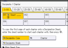 Use this function to have certain pages of your original copied onto designation sheets or to insert a designation sheet for each page specified.