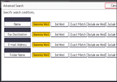 The following conditions can be specified for Address Book searches: Name, Fax Destination, E-mail Address, and Folder Name.