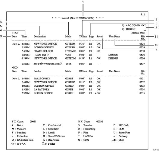 • The information displayed under "Other end" can be either the fax number or name registered in the machine's own address book, or the fax number or name registered by the other end, depending on which you prioritize. For details about prioritizing items of journal information, contact your service representative.